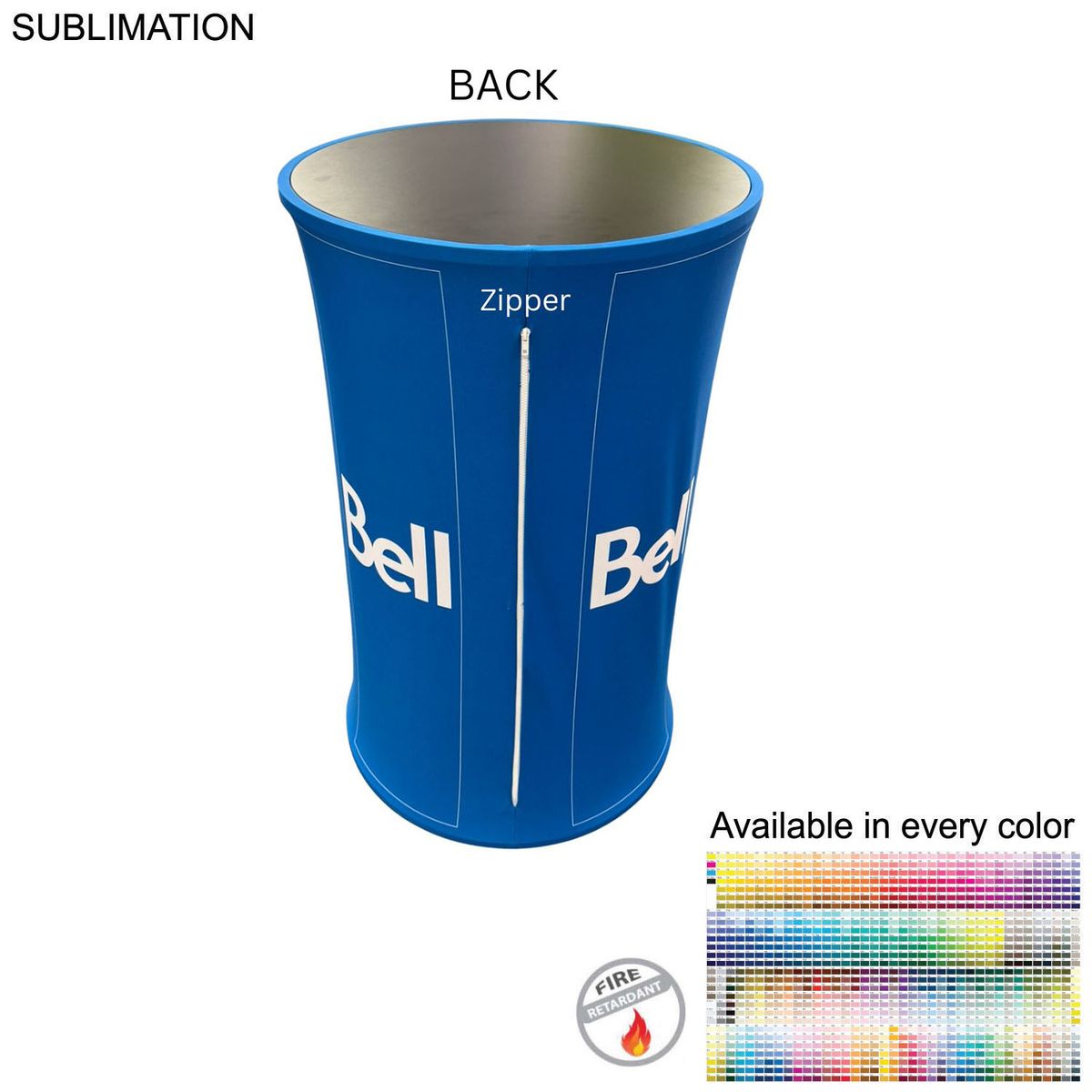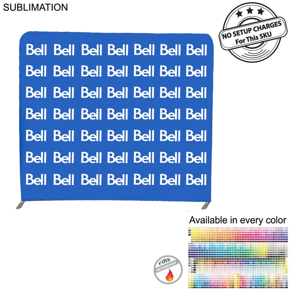 8' Wide x 8' High EuroFit Tension Fabric Double Sided Wall Display Kit (SU733) and Round SEG (silicone edge graphis) Counter Kit with Sublimated Cover (SU792). Package includes Displays and counter kit. Use this straight wall in a setting with ample display space. This double-sided display is lightweight and stylish. Double-sided graphic cover is viewable from both the front and back of the display for maximum visibility. You can do different graphics on both sides. Graphics can be whatever you want, step and repeat, Photo images, full colors logo (s). Setup and break down takes seconds and is convenient. Round SEG counter kit comes with dye sublimated cover. Sleek, fitted cover. Edge to edge graphics finished with a silicone tape for easy installation. Usage: Tradeshow booth, Display kit, Media Wall, Tradeshows Back drop, Zoom Meetings, Photo Backdrop, Corporate events, Wedding and Party photo backdrop, Press Conferences, Interviews, Retail, Events, Offices. Price includes full color graphics. Max Imprint: Displays: 96" x 96"L ; Counter Kit: 23.5"D x 38"H.