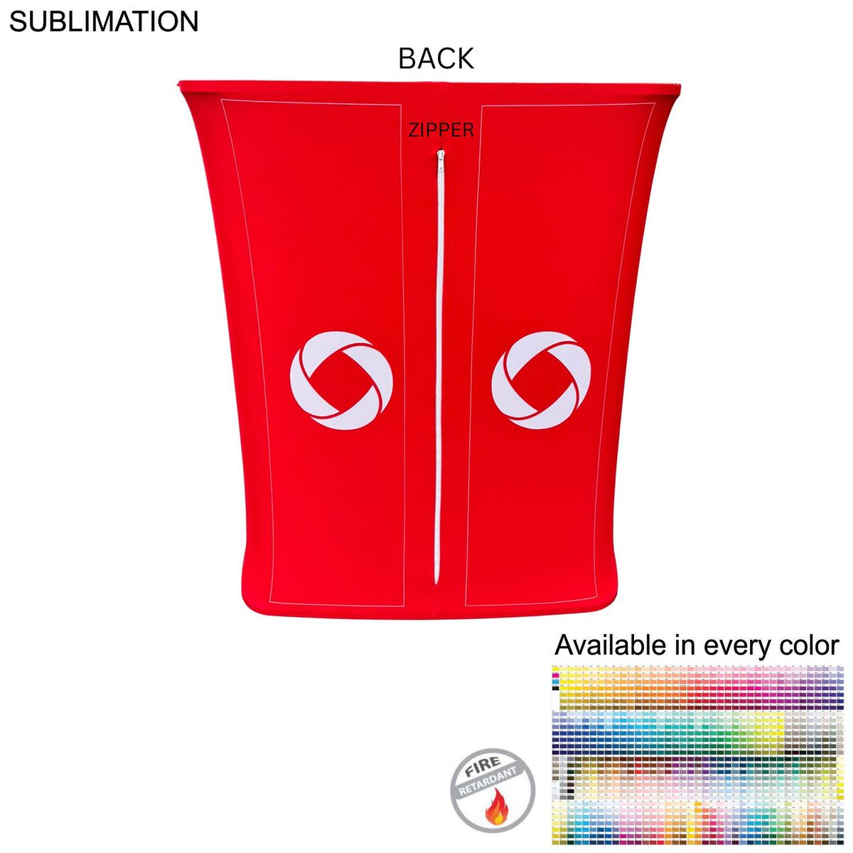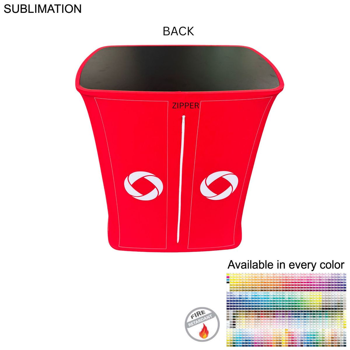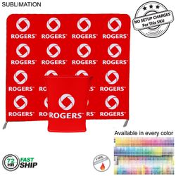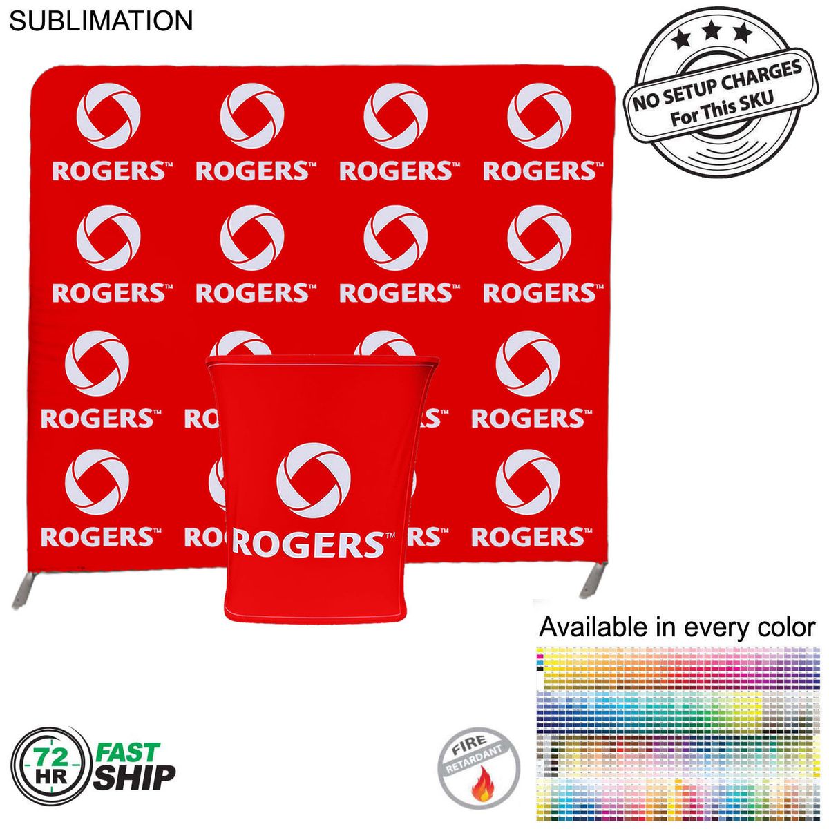 10' Wide x 8' High EuroFit Tension Fabric Double Sided Wall Display Kit (SU734) and Rectangular SEG (silicone edge graphics) Counter Kit with Sublimated Cover (SU791). Package includes Wall Display and counter kit. Use this straight wall in a setting with ample display space. This double-sided display is lightweight and stylish. Double-sided graphic cover is viewable from both the front and back of the display for maximum visibility. You can do different graphics on both sides. Graphics can be whatever you want, step and repeat, Photo images, full colors logo (s). Setup and break down takes seconds and is convenient. Rectangular SEG counter kit comes with dye sublimated cover. Sleek, fitted cover. Edge to edge graphics finished with a silicone tape for easy installation. Usage: Tradeshow Booth, Display kit, Media Wall, Conference, Photo Backdrop, Corporate events, Wedding and Party photo backdrop, Press Conferences, Interviews, Retail, Events, Offices. Price includes full color graphics. Max Imprint: Displays: 120" x 96"L ; Counter Kit: 31.5"W x 21"L x 38"H.
