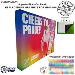 Out with the old, in with the new with replacement graphics produced from Superior Block out fabric. Completely prevents light from passing through the material. Replacing Graphics takes seconds to install and is convenient. Replacement Graphics for 10' wide Straight Wall Full Height Tension Fabric Pop-up Display, Hop-up banner with Wrap End Caps. Graphics have velcro in the back for easy installation to the hardware. Graphics can be whatever you want, step and repeat, Photo images, full colors logo (s). Hardware and carry bag not included.. Usage: Tradeshows, Events, Conferences, Business, Reception Area, Retail, Airport, Display kit, Media Wall, Zoom Meetings, Photo Backdrop, Corporate events, Wedding and Party photo backdrop, Press Conferences, Interviews, Retail, Offices. Price includes full color graphics edge to edge. Max Imprint: 120"W x 90"H