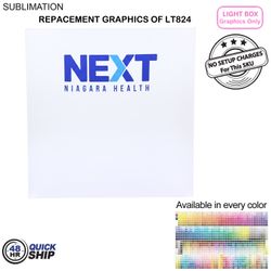 Out with the old, in with the new with replacement graphics. Replacing Graphics takes seconds and is convenient. Sublimation Graphics Printed 1 side in full color on Elite Backlit polyester fabric with Silicone Edge Graphics (SEG) binding to create a smooth, edge-to-edge finish with no wrinkles, curls. Graphics pricing is per side. If you need to replace graphics on both sides then order 2 of these. Hardware not included. Light Box Wall Hardware with LED lighting sku # BL824 or Full kit (light box Wall hardware and graphics on both sides) sku # LT824. Usage: Tradeshows, Events, Conferences, Business, Reception Area, Retail, Airport, Display kit, Media Wall, Zoom Meetings, Photo Backdrop, Corporate events, Wedding and Party photo backdrop, Press Conferences, Interviews, Retail, Offices. Max Imprint: 96"W x 96"H